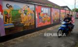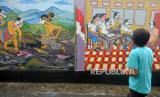 Warga menjelaskan arti mural tokoh Punakawan di tembok Dusun Karangwatu, Muntilan, Jawa Tengah, Rabu (1/6/2022). Lukisan tembok atau mural dengan tema Pancasila ini untuk memperingati Hari Lahir Pancasila pada 1 Juni. Selain mural Garuda Pancasila dan pahlawan nasional, disini terdapat juga mural tokoh Punakawan tentang kehidupan bermasyarakat. Mural ini dibuat secara swadaya selama 13 hari oleh sekitar 50an warga. (FOTO : Wihdan Hidayat / Republika)