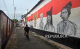 Mural bertema Pancasila di tembok Dusun Karangwatu, Muntilan, Jawa Tengah, Rabu (1/6/2022). Lukisan tembok atau mural dengan tema Pancasila ini untuk memperingati Hari Lahir Pancasila pada 1 Juni. Selain mural Garuda Pancasila dan pahlawan nasional, disini terdapat juga mural tokoh Punakawan tentang kehidupan bermasyarakat. Mural ini dibuat secara swadaya selama 13 hari oleh sekitar 50an warga. (FOTO : Wihdan Hidayat / Republika)