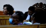 REPUBLIKA.CO.ID,DENPASAR -- Mantan Bupati Karangasem periode 2016-2021 I Gusti Ayu Mas Sumatri (kiri) memberikan keterangan saat menjadi saksi dalam sidang kasus dugaan korupsi pengadaan masker di Pengadilan Tindak Pidana Korupsi (Tipikor) Denpasar, Kamis (2/6/2022).