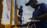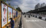 Pekerja menyelesaikan pembuatan mural di kawasan Ancol, Jakarta, Kamis (2/6/2022). Sebanyak 495 mural dibuat sepanjang Jalan RE Martadinata dalam rangka menyambut HUT ke-495 DKI Jakarta. Republika/Putra M. Akbar (FOTO : Republika/Putra M. Akbar)