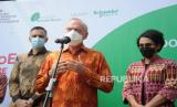 Duta Besar Perancis untuk Indonesia Mr. Olivier Chambard (tengah), Sekretaris Jenderal Kemendikbudristek Suharti (kanan) dan Cluster President Schneider Electric Indonesia & Timor Leste Roberto Rossi (kiri) berbicara kepada media saat meresmikan pembukaan revitalisasi fasilitas laboratorium di SMKN 1 Cikarang Selatan, Bekasi, Jawa Barat, Selasa (2/6/2022). (FOTO : Tahta Aidilla/Republika)