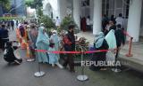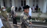 Para pentakziah antre dengan tertib saat acara takziah untuk putra sulung Gubernur Jawa Barat Ridwan Kamil, Emmeril Kahn Mumtadz atau Eril, di rumah dinas Gubernur Jawa Barat Gedung Pakuan, Kota Bandung, Sabtu (4/6). Acara takziah ini terdiri dari doa bersama, salat gaib, dan penyampaian bela sungkawa dari berbagai pihak. (FOTO : Edi Yusuf/Republika)