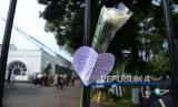 Warga menyematkan bunga bertuliskan ucapan belasungkawa di gerbang Gedung Pakuan..