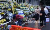 Warga meletakan bunga bertulisakan ucapan belasungkawa di pintu gerbang saat acara takziah untuk putra sulung Gubernur Jawa Barat Ridwan Kamil, Emmeril Kahn Mumtadz atau Eril, di rumah dinas Gubernur Jawa Barat Gedung Pakuan, Kota Bandung, Sabtu (4/6). Acara takziah ini terdiri dari doa bersama, salat gaib, dan penyampaian bela sungkawa dari berbagai pihak. (FOTO : Edi Yusuf/Republika)