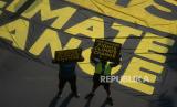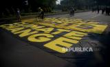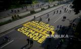 REPUBLIKA.CO.ID, JAKARTA -- Aktivis Greenpeace dan Bike2Work membentangkan spanduk dalam aksi memperingati Hari Lingkungan Hidup Sedunia dan Hari Sepeda Sedunia di Jalan Sudirman, Semanggi, Jakarta, Ahad (5/6/2022).
