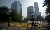 Aktivis Greenpeace dan Bike2Work membentangkan spanduk dalam aksi memperingati Hari Lingkungan Hidup Sedunia dan Hari Sepeda Sedunia di Jalan Sudirman, Semanggi, Jakarta, Ahad (5/6/2022). Aksi tersebut bertujuan mendorong agar sepeda menjadi solusi pembangunan rendah karbon dan Jakarta menjadi kota ramah bagi pengguna sepeda. (FOTO : Prayogi/Republika.)