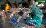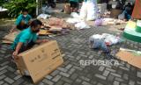 Relawan Gerakan Sedekah Sampah (GSS) memilah sampah sedekah warga di halaman Masjid Al Muharram, Bantul, Yogyakarta, Ahad (5/6/2022). Relawan akan mengambil dan memilah sedekah sampah dari warga sekitar setiap Ahad pertama di awal bulan. Sampah yang disedekahkan biasanya berupa kemasan plastik, botol, kertas, kardus yang masih memiliki manfaat. Hasil penjualan sampah nantinya akan menjadi kas GSS yang digunakan untuk kepentingan warga. (FOTO : Wihdan Hidayat / Republika)