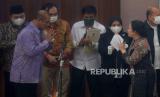 Ketua DPR Puan Maharani menyapa Ketua KPU Hasyim Asyari seusai memberikan keterangan pers hasil rapat konsultasi antara pimpinan DPR, Komisi II DPR dan KPU di Kompleks Parlemen, Senayan, Jakarta, Senin (6/6/2022). DPR dan KPU menyepakati durasi kampanye Pemilu 2024 berlangsung selama 75 hari dan menetapkan biaya tahapan sampai dengan pelaksanaan Pemilu yaitu sebesar Rp76,6 triliun. (FOTO : Prayogi/Republika.)