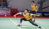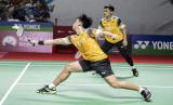 Pebulu tangkis ganda putra Indonesia Leo Rolly Carnando (kiri) dan Daniel Marthin (kanan) mengembalikan kok ke ganda putra Inggris Ben Lane/Sean Vendy pada babak kualifikasi Daihatsu Indonesia Masters 2022 di Istora Senayan, Jakarta, Selasa (7/6/2022). Pasangan Carnando dan Marthin mening dengan skor 10-21, 21-13 dan 21-12. (FOTO : ANTARA/Muhammad Adimaja)