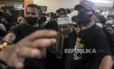 Pimpinan Khilafatul Muslimin Abdul Qadir Baraja (kanan) saat tiba di Mapolda Metro Jaya, Jakarta, Selasa (7/6/2022). Ditreskrimum Polda Metro Jaya menangkap Abdul Qadir Baraja di Lampung setelah ditetapkan sebagai tersangka terkait penyebaran berita bohong yang dapat menimbulkan keonaran dan kegaduhan di tengah masyarakat serta tindak pidana organisasi masyarakat yang bertentangan dengan Pancasila. Republika/Putra M. Akbar (FOTO : Republika/Putra M. Akbar)