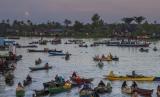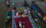 Pedagang menawarkan dagangannya kepada pengunjung di Wisata Pasar Terapung Lok Baintan, Kabupaten Banjar, Kalimantan Selatan, Rabu (8/6/2022). Pemerintah Provinsi Kalimantan Selatan menetapkan enam destinasi wisata menjadi prioritas dalam pengembangan, salah satunya wisata pasar terapung dan geopark Meratus yang berpotensi menjadikan sektor pariwisata dan ekonomi kreatif sebagai kekuatan baru ekonomi serta sebagai pintu gerbang IKN Nusantara di Kalimantan Timur.  (FOTO : ANTARA/Bayu Pratama S)
