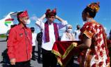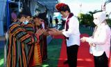REPUBLIKA.CO.ID, WAKATOBI -- Presiden Joko Widodo dan Ibu Iriana Joko Widodo (kiri) disambut Bupati Wakatobi Haliana saat tiba di Bandar Udara Matohara di Wakatobi, Sulawesi Tenggara, Kamis (9/6/2022). Kedatangan Presiden Jokowi tersebut dalam rangkaian pertemuan puncak Gugus Tugas Reforma Agraria di Kabupaten Wakatobi.