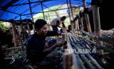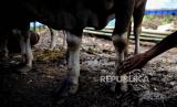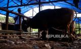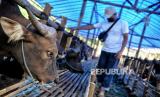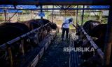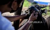Penjual hewan qurban mengecek kesehatan hewan di lapak penjualan hewan qurban di Jalan Jendral Basuki Rachmat, Cipinang Besar, Jakarta Timur, Kamis (9/6/2022). Menurut pedagang hewan kurban, jumlah pasokan hewan kurban menjelang Idul Adha 1443 H mengalami penurunan akibat wabah penyakit mulut dan kuku (PMK). Penurunan tersebut berimbas pada kenaikan harga sebesar 15 sampai 20 persen. Untuk harga satu ekor sapi sebelumnya kisaran Rp 14 juta, namun kini menembus harga Rp 15,8 juta. Sebagai antisipasi wabah PMK, pedagang hewan kurban mengirimkan pasokan hewan dari daerah yang tidak terkena wabah PMK seperti Bali, Kupang, dan Bima serta menunjukan bukti surat keterangan kesehatan hewan dari Dinas Pertanian dan Ketahanan Pangan Provinsi Bali. (FOTO : Republika/Thoudy Badai)