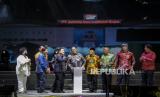 Gubernur DKI Jakarta Anies Baswedan (kelima kanan) bersama Menteri BUMN Erick Thohir, Ketua Mahkamah Konstitusi Anwar Usman Wakil Ketua MPR Hidayat Nur Wahid dan anggota DPR Arsul Sani (dari keempat kiri ke kanan) saat pembukaan Jakarta Fair 2022 di Jakarta International Expo (JIExpo), Kemayoran, Jakarta, Kamis (9/6/2022). Jakarta Fair 2022 atau Pekan Raya Jakarta yang diikuti oleh 2.500 perusahaan dengan membuka 1.500 stan yang memamerkan berbagai produk unggulan serta hiburan konser musik itu telah resmi dibuka dan berlangsung hingga 17 Juli 2022. Republika/Putra M. Akbar (FOTO : Republika/Putra M. Akbar)