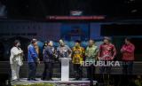 Gubernur DKI Jakarta Anies Baswedan (kelima kanan) bersama Menteri BUMN Erick Thohir, Ketua Mahkamah Konstitusi Anwar Usman Wakil Ketua MPR Hidayat Nur Wahid dan anggota DPR Arsul Sani (dari keempat kiri ke kanan) saat pembukaan Jakarta Fair 2022 di Jakarta International Expo (JIExpo), Kemayoran, Jakarta, Kamis (9/6/2022). Jakarta Fair 2022 atau Pekan Raya Jakarta yang diikuti oleh 2.500 perusahaan dengan membuka 1.500 stan yang memamerkan berbagai produk unggulan serta hiburan konser musik itu telah resmi dibuka dan berlangsung hingga 17 Juli 2022. (FOTO : Republika/Putra M. Akbar)