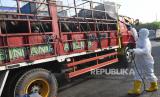 Petugas Badan Karantina Pertanian Kementerian Pertanian menyemprotkan cairan anti bakteri ke truk bermuatan sapi asal Nusa Tenggara Timur (NTT) di Pelabuhan Tanjung Priok, Jakarta, Jumat (10/6/2022). Kementerian Pertanian menjamin ketersediaan hewan kurban menjelang Idul Adha tahun ini dan melakukan antisipasi penyebaran penyakit mulut dan kuku (PMK) dengan menerapkan protokol kesehatan, termasuk penyemprotan desinfektan. (FOTO : ANTARA/Aditya Pradana Putra)