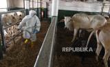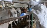 Petugas Badan Karantina Pertanian Kementerian Pertanian memeriksa kondisi sapi asal Nusa Tenggara Timur (NTT) di Pelabuhan Tanjung Priok, Jakarta, Jumat (10/6/2022). Kementerian Pertanian menjamin ketersediaan hewan kurban menjelang Idul Adha tahun ini dan melakukan antisipasi penyebaran penyakit mulut dan kuku (PMK) dengan menerapkan protokol kesehatan, termasuk penyemprotan desinfektan. (FOTO : ANTARA/Aditya Pradana Putra)
