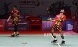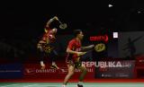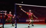 Pebulu tangkis ganda putra Indonesia Fajar Alfian/Rian Ardianto mengembalikan kok ke arah ganda putra Taiwan Lee Yang/Wang Chi Lin pada babak perempat final Daihatsu Indonesia Master 2022 di Istora Senayan, Jakarta, Jumat (10/6/2022). Pada pertandingan itu Fajar/Rian menang dengan skor 21-15, 21-18 dan melaju ke babak semifinal. (FOTO : Republika/Edwin Dwi Putranto)