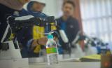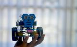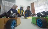 REPUBLIKA.CO.ID,PADANG -- Guru menunjukan kemampuan robot memindahkan barang secara otomatis, saat sosialisasi di SMK Pembangunan Teknologi Robotik UNP di Padang, Sumatera Barat, Sabtu (11/6/2022).