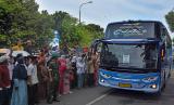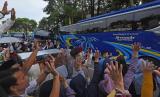 REPUBLIKA.CO.ID, SERANG -- Sejumlah calon haji melambaikan tangan kepada sanak keluaerganya saat diberangkatkan dari Alun-alun Serang, Banten, Minggu (12/6/2022). Sebanyak 377 orang calon haji asal Serang yang tergabung dalam kloter 17 berangkat menuju Asrama Haji Pondok Gede untuk diterbangkan ke Tanah Suci.