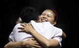 Pebulu tangkis ganda putri Indonesia Greysia Polii (kanan) memeluk mantan pasangan bulu tangkis ganda putrinya Apriyani Rahayu (kiri) pada acara Testimonial Day Greysia Polii di Istora Senayan, Jakarta, Ahad (12/6/2022). Dalam acara tersebut Greysia Polii yang juga peraih medali emas Olimpiade Tokyo 2020 itu, secara resmi mengumumkan pensiun sebagai atlet bulu tangkis profesional. (FOTO : ANTARA/Muhammad Adimaja)