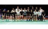 Pebulu tangkis ganda putri Indonesia Greysia Polii (ketujuh kiri depan) dan pebulu tangkis ganda putri Indonesia Apriyani Rahayu (kedua kanan depan) berfoto bersama sejumlah atlet bulu tangkis profesional lainnya pada acara Testimonial Day Greysia Polii di Istora Senayan, Jakarta, Ahad (12/6/2022). Dalam acara tersebut Greysia Polii yang juga peraih medali emas Olimpiade Tokyo 2020 itu, secara resmi mengumumkan pensiun sebagai atlet bulu tangkis profesional. (FOTO : ANTARA/Muhammad Adimaja)