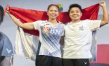 Pebulu tangkis ganda putri Indonesia Greysia Polii (kiri) berfoto dengan mantan pasangan bulu tangkis ganda putrinya Apriyani Rahayu (kanan) pada acara Testimonial Day Greysia Polii di Istora Senayan, Jakarta, Ahad (12/6/2022). Dalam acara tersebut Greysia Polii yang juga peraih medali emas Olimpiade Tokyo 2020 itu, secara resmi mengumumkan pensiun sebagai atlet bulu tangkis profesional. (FOTO : ANTARA/Muhammad Adimaja)