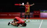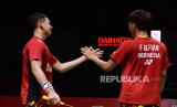 Ekspresi pebulu tangkis ganda putra Indonesia Fajar Alfian/Rian Ardianto seusai mengalahkan ganda putra Cina Liang Wei Keng/Wang Chang pada babak final Daihatsu Indonesia Master 2022 di Istora Senayan, Jakarta, Ahad (12/6/2022). Pada pertandingan itu Fajar/Rian menang dengan skor 21-10, 21-17 dan keluar sebagai juara. (FOTO : Republika/Edwin Dwi Putranto)