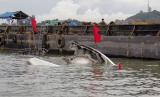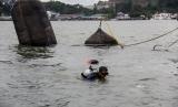 REPUBLIKA.CO.ID, BATAM -- Penyelam dari tim evakuasi melakukan proses pengangkatan bangkai kapal ferry MV Dumai Line 5 di perairan Pelabuhan Domestik Sekupang, Batam, Kepulauan Riau, Minggu (12/6/2022). Kapal feri MV Dumai Line 5 yang tengah labuh jangkar terbakar saat melakukan pengisian Bahan Bakar Minyak (BBM) pada Rabu (8/6) malam.