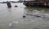 Bangkai kapal ferry MV Dumai Line 5 tenggelam di perairan Pelabuhan Domestik Sekupang, Batam, Kepulauan Riau, Ahad (12/6/2022).Kapal feri MV Dumai Line 5 yang tengah labuh jangkar terbakar saat melakukan pengisian Bahan Bakar Minyak (BBM) pada Rabu (8/6) malam. (FOTO : ANTARA/Teguh Prihatna)