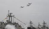 Tiga pesawat udara Pusat Penerbangan Angkatan Laut (Puspenerbal) melakukan manuver udara disela-sela Serah Terima Jabatan Panglima Komando Armada (Pangkoarmada) RI, Pangkoarmada II dan Komandan Sekolah Tinggi Teknologi Angkatan Laut (STTAL) di Dermaga Sunda Komplek Satuan Kapal Koarmada I, Pondok Dayung, Tanjung Priok, Jakarta Utara, Senin (13/6/2022). Kepala Staf Angkatan Laut (KASAL) Laksamana TNI Yudo Margono melantik tiga jabatan strategis antara lain, Laksamana Muda TNI Abdul Rasyid K sebagai Pangkoarmada RI menggantikan Laksamana Madya TNI Agung Prasetiawan, sedangkan jabatan Pangkoarmada II dari Laksamana Muda TNI Iwan Isnurwanto digantikan oleh Laksamana Muda TNI T.S.N.B Hutabarat dan jabatan Komandan STTAL dari Laksamana Pertama TNI Avando Bastari digantikan oleh Kolonel Laut (E) Mukhlis. (FOTO : ANTARA/M Risyal Hidayat)
