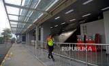 Petugas keamanan berjaga di Stasiun Matraman, Jakarta, Senin (13/6/2022). KAI Commuter bersama Direktorat Jenderal Perkeretaapian Kementerian Perhubungan dan KAI Daop 1 Jakarta akan mengoperasikan Stasiun Matraman yang berada di antara lintas Stasiun Manggarai dan Stasiun Jatinegara dan diharapkan dapat menjadi salah satu alternatif bagi pengguna untuk naik dan turun selain di kedua stasiun tersebut.Prayogi/Republika. (FOTO : Prayogi/Republika.)