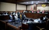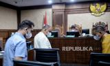 Suasana sidang perdana dengan terdakwa Bupati Langkat nonaktif, Terbit Rencana Perangin Angin di Pengadilan Tipikor, Jakarta Pusat, Senin (13/6/2022). Sidang tersebut beragendakan pembacaan surat dakwaan terkait dugaan suap penerimaan hadiah atau janji terkait pengadaan barang dan jasa di Kabupaten Langkat tahun 2020-2022 dengan terdakwa Bupati Langkat nonaktif Terbit Rencana Perangin Angin bersama empat orang lainnya diantaranya Iskandar Perangin Angin serta terdakwa dari pihak swasta yaitu Marcos Surya Abdi, Isfi Syahfitra dan Shuhanda Citra. Republika/Thoudy Badai (FOTO : Republika/Thoudy Badai)