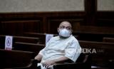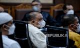 Terdakwa Bupati Langkat nonaktif, Terbit Rencana Perangin Angin saat menjalani sidang perdana di Pengadilan Tipikor, Jakarta Pusat, Senin (13/6/2022). Sidang tersebut beragendakan pembacaan surat dakwaan terkait dugaan suap penerimaan hadiah atau janji terkait pengadaan barang dan jasa di Kabupaten Langkat tahun 2020-2022 dengan terdakwa Bupati Langkat nonaktif Terbit Rencana Perangin Angin bersama empat orang lainnya diantaranya Iskandar Perangin Angin serta terdakwa dari pihak swasta yaitu Marcos Surya Abdi, Isfi Syahfitra dan Shuhanda Citra. Republika/Thoudy Badai (FOTO : Republika/Thoudy Badai)
