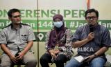 REPUBLIKA.CO.ID, JAKARTA -- Kepala Ekonom The Indonesia Economic Intelligence Surnarsip (kanan) Peternak Mitra Qurban Dompet Dhuafa Eko Aris Setyawan (kiri), Dokter Hewan Dian Ariesiana Widiastuti (tengah) saat konferensi pers terkait Qurban di Jakarta, Kamis (16/6/2022).