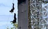 Prajurit TNI AD menuruni menara saat upaya pembebasan sandera pada kegiatan Simulasi Pengamanan KTT G20 di Denpasar, Bali, Kamis (16/6/2022). Simulasi yang dilaksanakan oleh empat satuan jajaran Kodam IX/Udayana yaitu Yonif Raider 900/Satya Bhakti Wirottama, Yonif 741/Garuda Nusantara, Yonzipur 18/Yudha Karya Raksaka, dan Denkav 4/Simha Pasupati itu dilakukan sebagai persiapan pengamanan KTT G20. (FOTO : ANTARA/Fikri Yusuf)