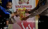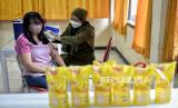 Warga menerima bantuan minyak goreng usai divaksin booster Covid-19 di Polsek Jagakarsa, Jakarta, Jumat (17/6/2022). Menurut data dari Satuan Tugas Penanganan Covid-19, jumlah penerima vaksin dosis penguat atau bosster di Indonesia mencapai 48,2 juta jiwa atau 23,17 persen dari total masyarakat yang menjadi target penerima vaksin booster di Indonesia berjumlah sekitar 208 juta jiwa. Sejumlah pakar kesehatan mengatakan bahwa vaksin Covid-19 yang beredar di masyarakat saat ini masih efektif untuk menekan laju penyebaran varian baru BA4 dan BA5. (FOTO : Republika/Thoudy Badai)