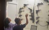 Anak-anak melihat koleksi senjata yang pernah dipakai tentara Indonesia dan asing di Museum Perjuangan Tridaya Eka Dharma, Bukittinggi, Sumatera Barat, Sabtu (18/6/2022). Museum yang menempati bangunan bekas rumah peristirahatan Gubernur Sumatera yang diresmikan Bung Hatta pada tahun 1973 itu, memiliki berbagai koleksi benda bersejarah diantaranya beragam senjata, perlengkapan perang, pemancar radio, alat penerima sinyal, telepon dan juga pakaian para tentara Indonesia dan tentara asing. (FOTO : ANTARA/Iggoy el Fitra)
