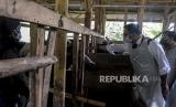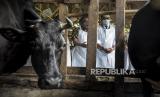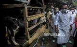 Gubernur Jawa Barat Ridwan Kamil (kanan) meninjau hewan ternak sapi yang telah disuntik vaksin penyakit mulut dan kuku (PMK) di Cilembu, Kabupaten Sumedang, Senin (20/6/2022). Pemerintah Provinsi Jawa Barat menargetkan pada pekan pertama dapat melaksanakan vaksinasi PMK bagi 2.000 hewan ternak di seluruh Jawa Barat dan lima kawasan sentral sapi seperti Kabupaten Bandung, Kabupaten Bandung Barat, Garut, Kuningan dan Sumedang. Foto: Republika/Abdan Syakura (FOTO : REPUBLIKA/ABDAN SYAKURA)