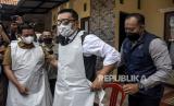 Gubernur Jawa Barat Ridwan Kamil (tengah) bersama Bupati Sumedang Dony Ahmad Munir (kiri) mengenakan alat pelindung diri (APD) sebelum meninjau vaksinasi penyakit mulut dan kuku (PMK) hewan ternak sapi di Cilembu, Kabupaten Sumedang, Senin (20/6/2022). Pemerintah Provinsi Jawa Barat menargetkan pada pekan pertama dapat melaksanakan vaksinasi PMK bagi 2.000 hewan ternak di seluruh Jawa Barat dan lima kawasan sentral sapi seperti Kabupaten Bandung, Kabupaten Bandung Barat, Garut, Kuningan dan Sumedang. Foto: Republika/Abdan Syakura (FOTO : REPUBLIKA/ABDAN SYAKURA)