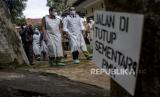 Gubernur Jawa Barat Ridwan Kamil (kanan) bersama Bupati Sumedang Dony Ahmad Munir (kiri) mengenakan alat pelindung diri (APD) berjalan menuju kandang sapi untuk meninjau vaksinasi penyakit mulut dan kuku (PMK) hewan ternak sapi di Cilembu, Kabupaten Sumedang, Senin (20/6/2022). Pemerintah Provinsi Jawa Barat menargetkan pada pekan pertama dapat melaksanakan vaksinasi PMK bagi 2.000 hewan ternak di seluruh Jawa Barat dan lima kawasan sentral sapi seperti Kabupaten Bandung, Kabupaten Bandung Barat, Garut, Kuningan dan Sumedang. Foto: Republika/Abdan Syakura (FOTO : REPUBLIKA/ABDAN SYAKURA)