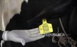 Dokter hewan menunjukkan eartag (penanda) pada hewan ternak sapi yang telah disuntik vaksin penyakit mulut dan kuku (PMK) di Cilembu, Kabupaten Sumedang, Senin (20/6/2022). Pemerintah Provinsi Jawa Barat menargetkan pada pekan pertama dapat melaksanakan vaksinasi PMK bagi 2.000 hewan ternak di seluruh Jawa Barat dan lima kawasan sentral sapi seperti Kabupaten Bandung, Kabupaten Bandung Barat, Garut, Kuningan dan Sumedang. Foto: Republika/Abdan Syakura (FOTO : REPUBLIKA/ABDAN SYAKURA)