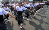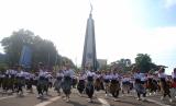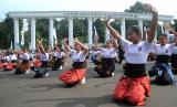 REPUBLIKA.CO.ID,BOGOR -- Sejumlah peserta menari secara kolosal di depan Tugu Kujang, Kota Bogor, Jawa Barat, Senin (20/6/2022).