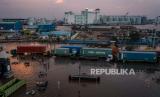 Foto udara sejumlah truk pengangkut kontainer mengantre untuk menembus banjir limpasan air laut ke daratan atau rob yang merendam kawasan Pelabuhan Tanjung Emas Semarang, Jawa Tengah, Senin (20/6/2022). Banjir rob dengan ketinggian bervariasi hingga mencapai 70 sentimeter itu disebabkan oleh tingginya pasang air laut serta dugaan adanya resapan air laut yang masuk melalui sejumlah titik di kawasan tersebut. (FOTO : ANTARA/Aji Styawan)
