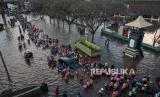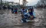 REPUBLIKA.CO.ID,SEMARANG -- Pekerja industri kawasan pelabuhan mendorong motornya yang mogok menembus banjir limpasan air laut ke daratan atau rob yang merendam kawasan Pelabuhan Tanjung Emas Semarang, Jawa Tengah, Senin (20/6/2022).