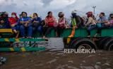 Pekerja industri kawasan pelabuhan menumpang truk trailer untuk dapat menembus banjir limpasan air laut ke daratan atau rob yang merendam kawasan Pelabuhan Tanjung Emas Semarang, Jawa Tengah, Senin (20/6/2022). Banjir rob dengan ketinggian bervariasi hingga mencapai 70 sentimeter itu disebabkan oleh tingginya pasang air laut serta dugaan adanya resapan air laut yang masuk melalui sejumlah titik di kawasan tersebut. (FOTO : ANTARA/Aji Styawan)