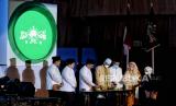 REPUBLIKA.CO.ID,JAKARTA -- Rais Aam PBNU Miftachul Akhya bersama Katib Aam PBNU Ahmad Said Asrori, Ketua Umum PBNU Yahya Cholil Staquf, Sekjen PBNU Saifullah Yusuf, Ketua Pengarah Erick Thohir dan Ketua Pelaksana Acara Yenny Wahid saat meresmikan pembukaan Peringatan Harlah 1 Abad Nahdlatul Ulama di Hotel Sultan, Jakarta, Senin (20/6/2022).
