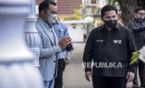 Menteri BUMN Erick Thohir berjalan menuju mobil usai bertakziah di Gedung Pakuan, Jalan Pasir Kaliki, Kota Bandung, Selasa (21/6/2022). Menteri BUMN Erick Thohir bersama istri bertakziah untuk menyampaikan belasungkawa secara langsung atas meninggalnya Emmeril Kahn Mumtadz atau Eril, putra sulung Gubernur Jawa Barat Ridwan Kamil. Foto: Republika/Abdan Syakura (FOTO : REPUBLIKA/ABDAN SYAKURA)