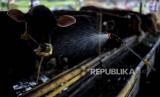 Pedagang hewan kurban memberikan pakan di tenda penjualan hewan kurban di kawasan Kuningan, Jakarta, Selasa (21/6/2022). Menurut pedagang, jumlah persediaan hewan kurban tahun ini mengalami penurunan diakibatkan jumlah pasokan yang menurun akibat wabah penyakit mulut dan kuku (PMK) hingga 70 persen atau sebanyak 30 ekor sapi dari tahun sebelumnya mampu menyediakan sebanyak 100 ekor sapi. Republika/Thoudy Badai (FOTO : Republika/Thoudy Badai)