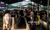 Warga melihat hewan kurban di tenda penjualan hewan kurban di kawasan Kuningan, Jakarta, Selasa (21/6/2022). Menurut pedagang, jumlah persediaan hewan kurban tahun ini mengalami penurunan diakibatkan jumlah pasokan yang menurun akibat wabah penyakit mulut dan kuku (PMK) hingga 70 persen atau sebanyak 30 ekor sapi dari tahun sebelumnya mampu menyediakan sebanyak 100 ekor sapi. Republika/Thoudy Badai (FOTO : Republika/Thoudy Badai)